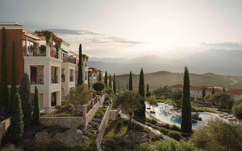 The architecture reflects the traditional Montenegrin style enhanced with contemporary design, blending natural stone, elegant lines, and modern interiors. Each residence features bright open living spaces extending onto spacious balconies or terraces. Select homes enjoy stunning views of Trašte Bay, Bay of Kotor, and the Adriatic coastline.