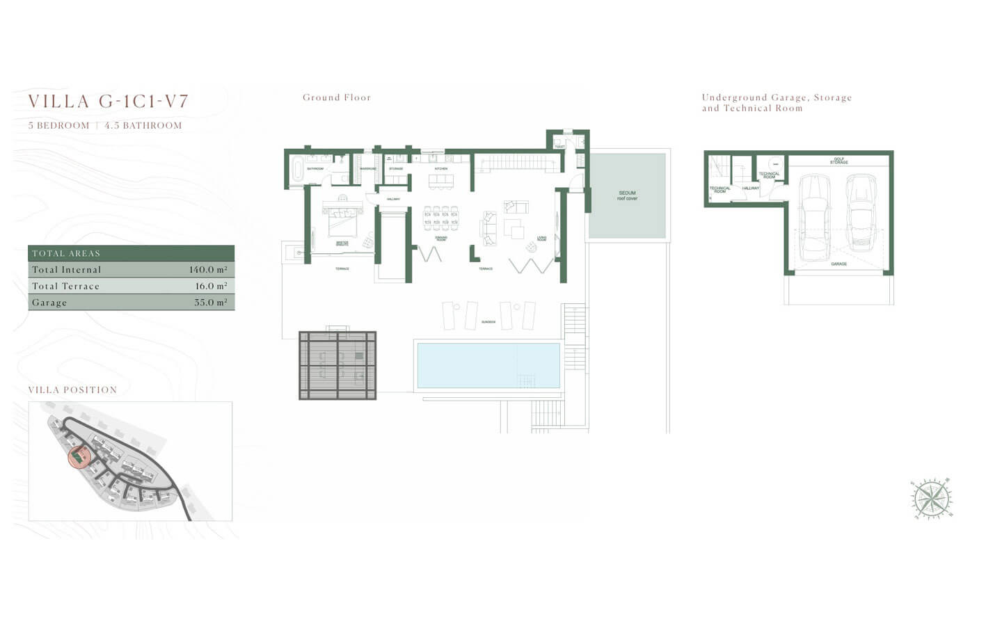 On the ground floor there are spacios open-space living room with dining room and kitchen; one bedroom with bathroom; storage space, toilet and entrance to a terrace with a sunbathing area and swimming pool. At the first floor are two master bedrooms with master bathrooms and wardrobes, two more bedrooms, a bathroom and a laundry room. All bedrooms have terracess with a beautiful sea view. Villa also has underground garage space for two cars, storage space and technical room.