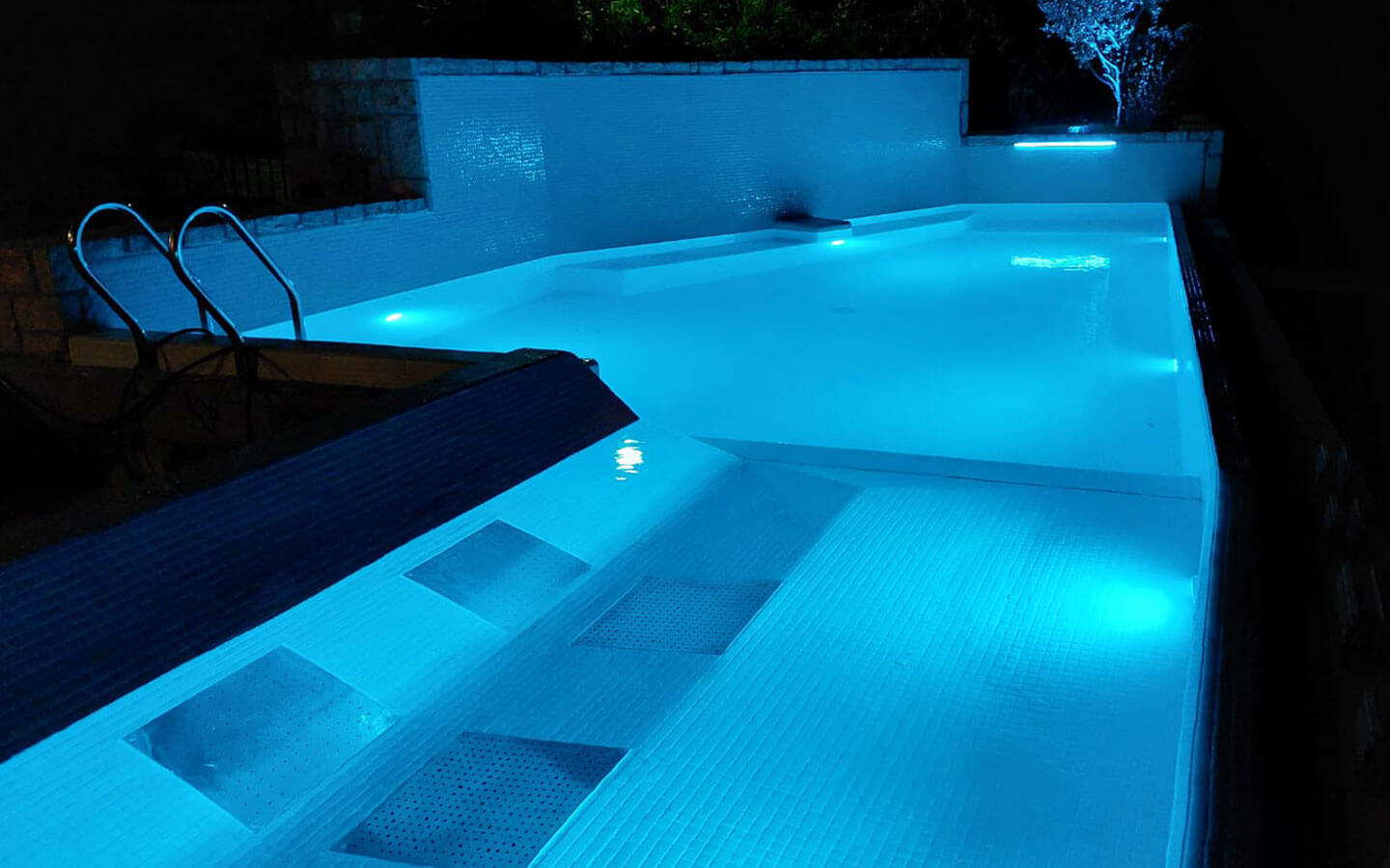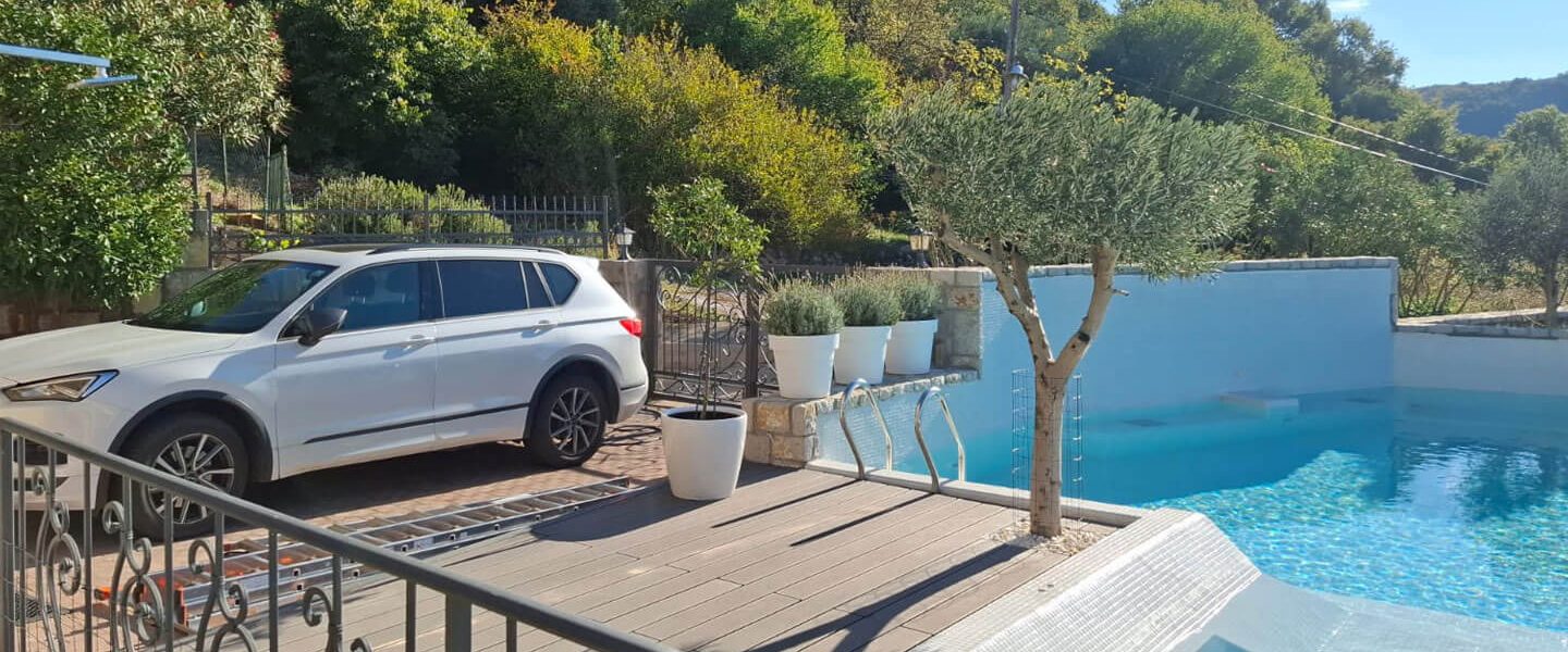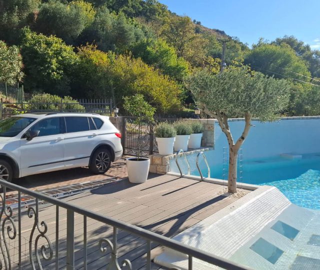 positioned next to the access road and overlooking the open sea. Beneath the pool, there is a garage