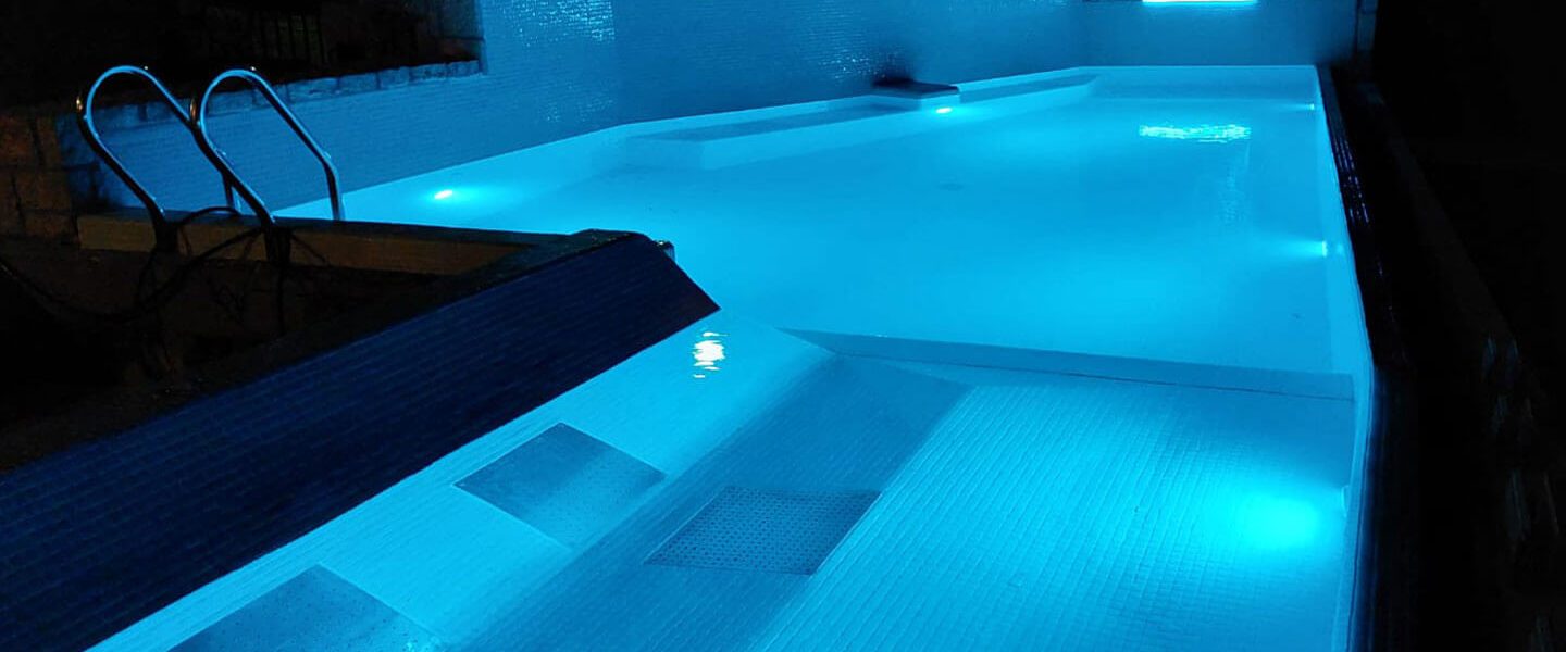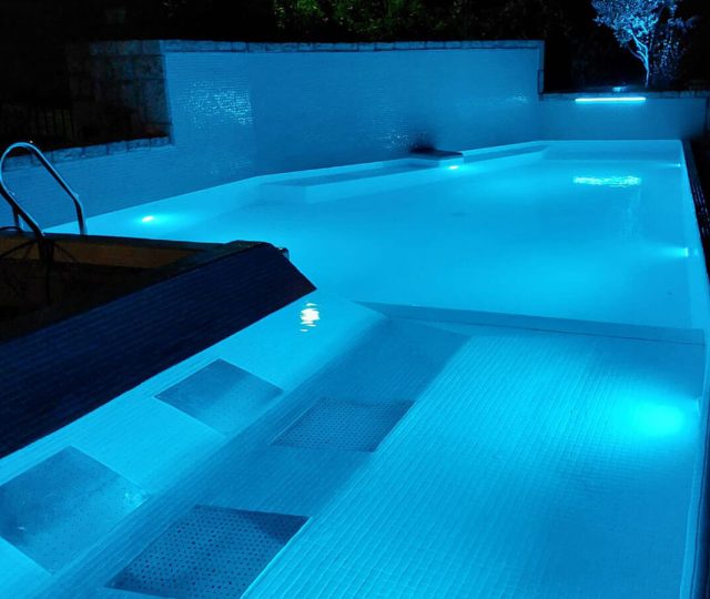 The villa features a saltwater infinity swimming pool with decorative fountain effects, beautifully