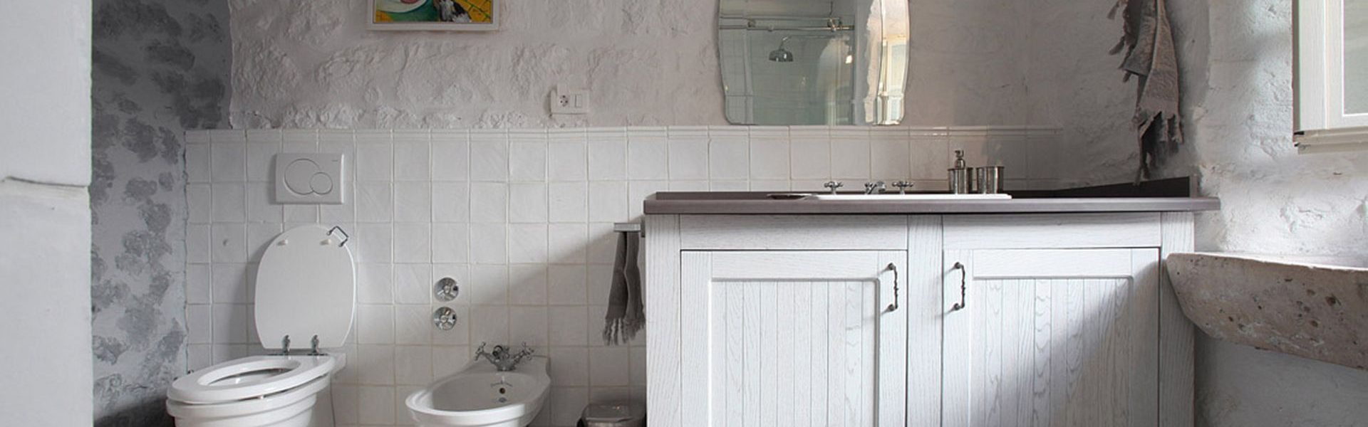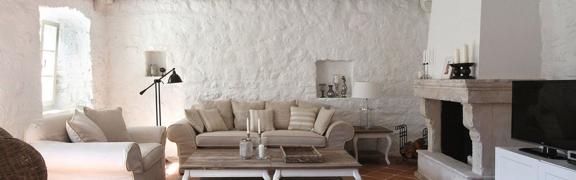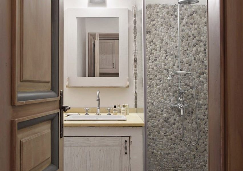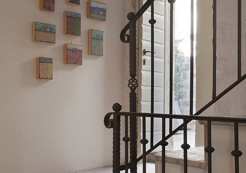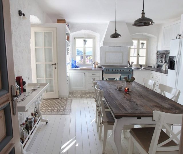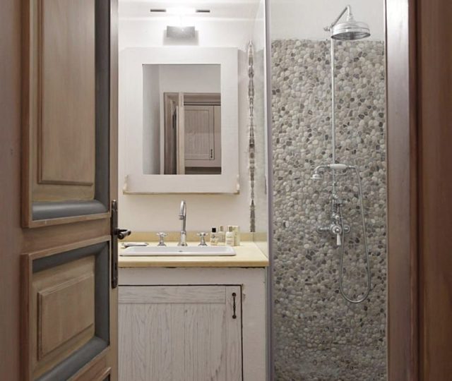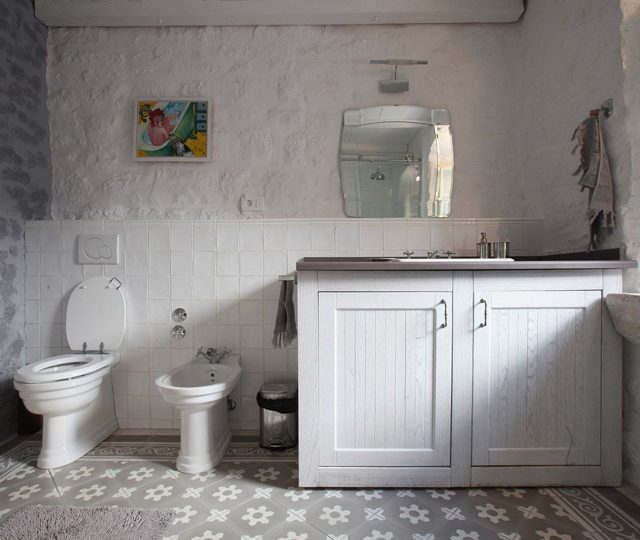 From the spacious terrace, you have access right to the ground floor. There is the kitchen and living area with an old-fashioned stone fireplace, wine cellar, and the extra apartment next to the living room, with its bathroom and a small kitchen.