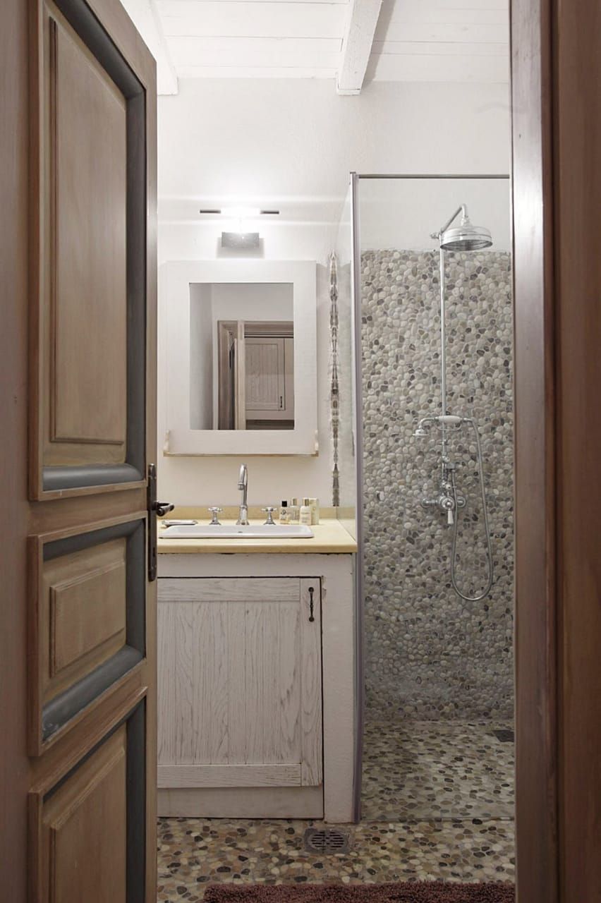 From the spacious terrace, you have access right to the ground floor. There is the kitchen and living area with an old-fashioned stone fireplace, wine cellar, and the extra apartment next to the living room, with its bathroom and a small kitchen.